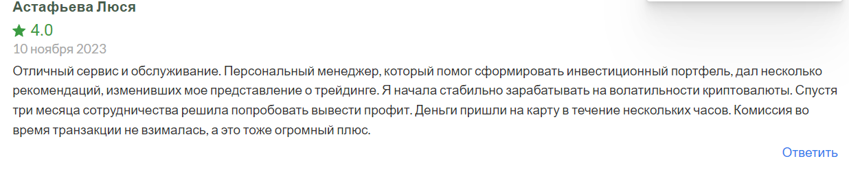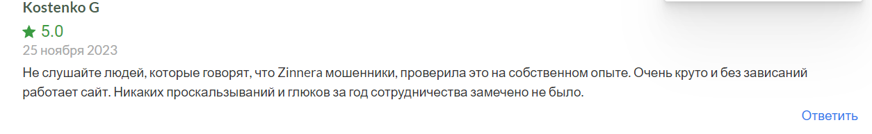 Отзывы о брокере Zinnera также вдохновляют уверенность. Реальные клиенты в интернете выражают удовлетворение от партнерства с ней и настоятельно рекомендуют регистрироваться здесь всем, кто стремится успешно и комфортно торговать на финансовых рынках.