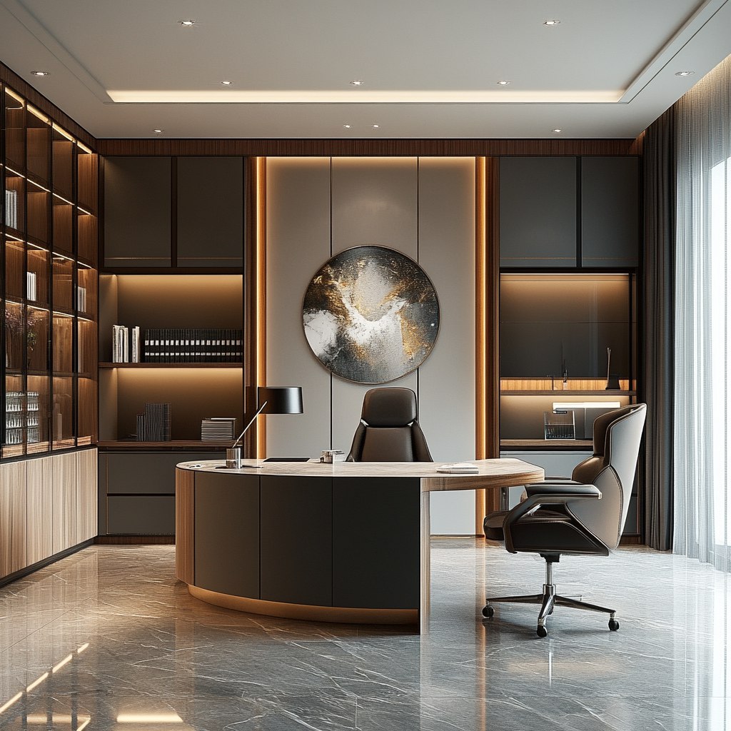 • Модернизированный стиль: Сочетает в себе элементы современности и классики, придавая офису комфортный, но при этом презентабельный вид.