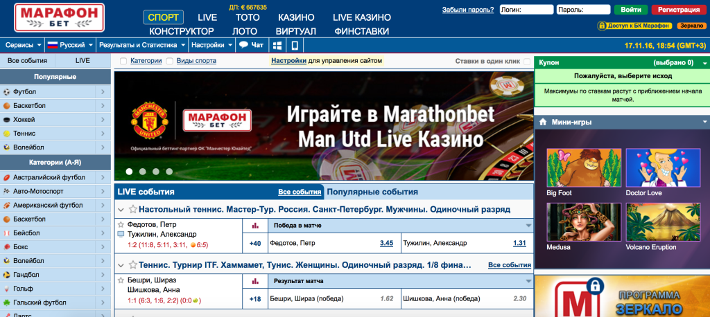 Собственный URL- адрес это единственное отличие, которое есть у зеркала в отличие от официального сайта. Все информативные способности, а также инструментарий использования сервиса сохранены. Также нет необходимости проходить повторно процедуру регистрации. С учетом того, что зеркало Марафонбет имеет постоянные обновления, чтобы полностью соответствовать оригиналу, также оно использует более новейшее программное обеспечение, что позволяет использовать сайт в удобном варианте.