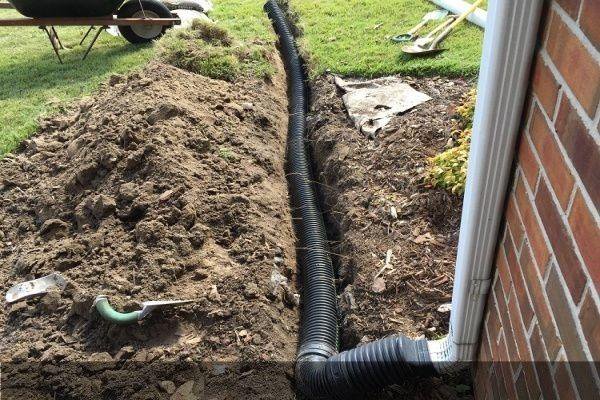 - Подготовьте место для установки канав или котлованов для сетки дренажных труб. Они должны быть рытые на участке в направлении от места скапливания воды.